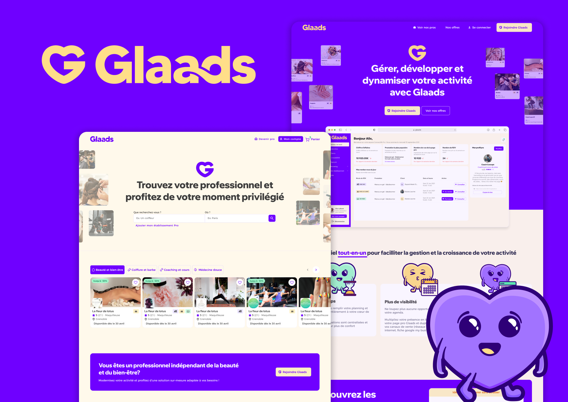 J’ai travaillé sur la refonte complète de Glaads (anciennement Connectilib) au sein de l’agence Ascanio.Glaads est une plateforme permettant de rechercher et réserver facilement des prestations (beauté, bien‑être, massages, etc.) à domicile, en visio ou chez un professionnel pour les particuliers, ainsi qu’une interface professionnelle (glaads.pro) pour les prestataires.