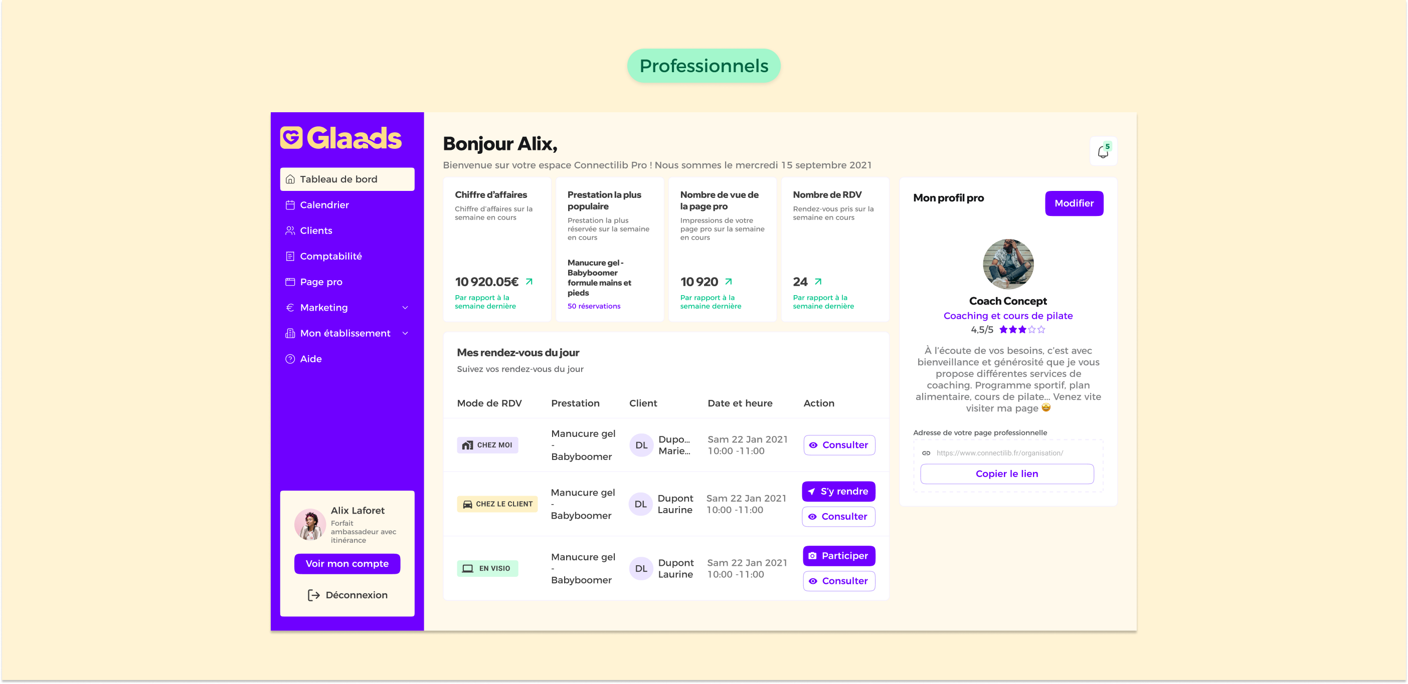 - Refonte UX/UI pour les professionnels (glaads.pro) :